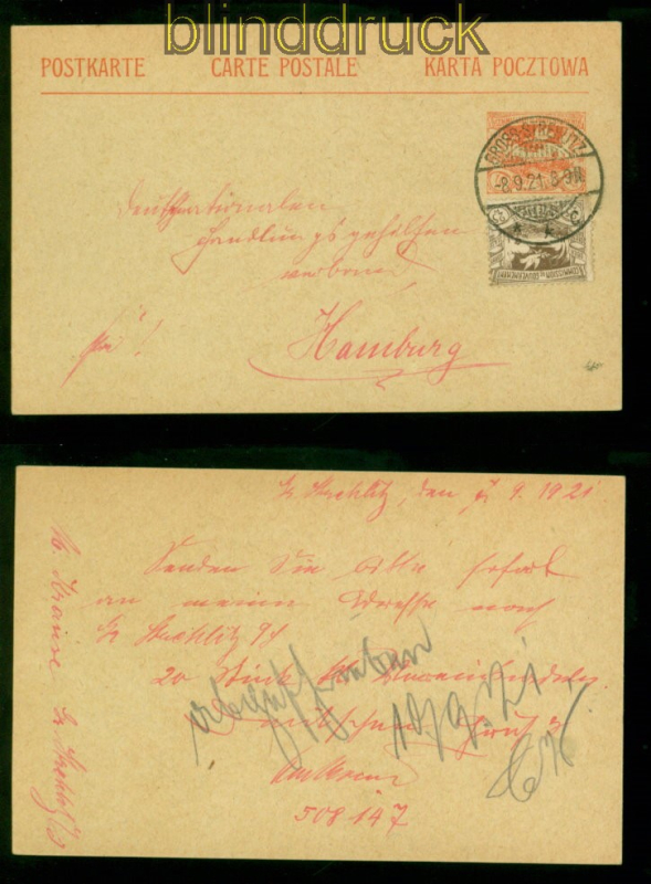 Abstimmungsgebiete Oberschlesien GSK P 3 mit # 19 MiF Groß-Strelitz 8.9.1921 nach Hamburg 10 Pfennig Ganzsachenkarte in Mischfrankatur mit Mi # 19 Karte gelaufen aus Groß-Strelitz 8.9.1921 nach Hamburg Ortsstempelnummer laut Handbuch: 112.6 Erhaltung siehe Scan