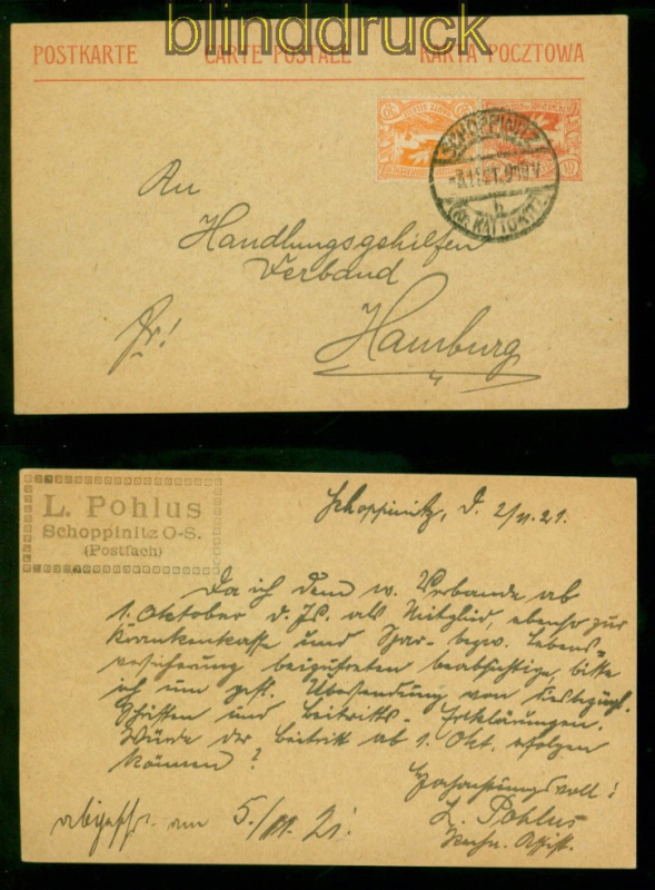 Abstimmungsgebiete Oberschlesien GSK P 3 mit # 20 MiF Schoppwitz 3.11.1921 nach Hamburg 10 Pfennig Ganzsachenkarte in Mischfrankatur mit Mi # 20 Karte gelaufen aus Schoppwitz 3.11.1921 nach Hamburg Ortsstempelnummer laut Handbuch: 317.3 Erhaltung siehe Scan