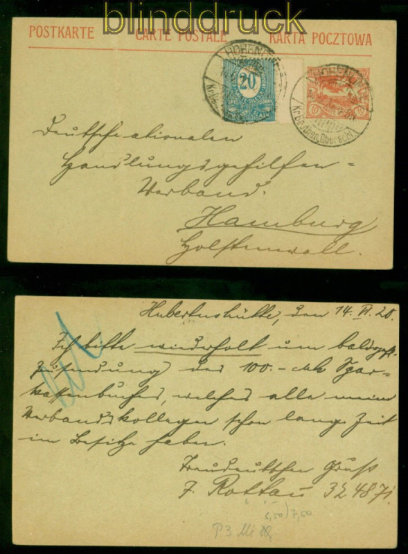 Abstimmungsgebiete Oberschlesien GSK P 3 mit # 6 ZS MiF Hohenlinde 14.6.1920 nach Hamburg 10 Pfennig Ganzsachenkarte in Mischfrankatur mit Mi # 6 ZS Zwischensteg Karte gelaufen aus Hohenlinde 14.6.1920 nach Hamburg Ortsstempelnummer laut Handbuch: 122.1 Erhaltung siehe Scan
