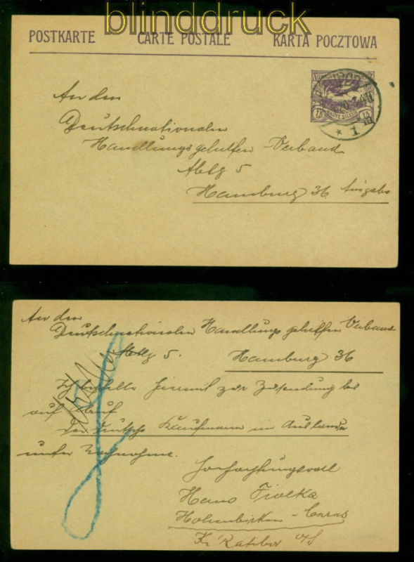 Oberschlesien GSK P 4 gestempelt Ratibor 26.4.1920 nach Hamburg (57627)