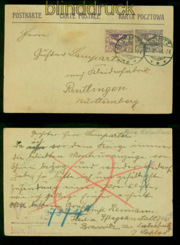 Abstimmungsgebiete Oberschlesien GSK P 4 mit # 17 MiF Branitz 22.3.1921 nach Reutlingen 15 Pfennig Ganzsachenkarte in Mischfrankatur mit Mi # 17 Karte gelaufen aus Branitz 22.3.1921 nach Reutlingen Ortsstempelnummer laut Handbuch: 035.1 Erhaltung siehe Scan