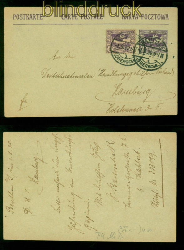 Abstimmungsgebiete Oberschlesien GSK P 4 und # 17 MiF Beuthen 1.8.1920 nach Hamburg 15 Pfennig Ganzsachenkarte in Mischfrankatur mit Mi # 17 Karte gelaufen aus Beuthen 1.8.1920 nach Hamburg Ortsstempelnummer laut Handbuch: 015.14 Erhaltung siehe Scan