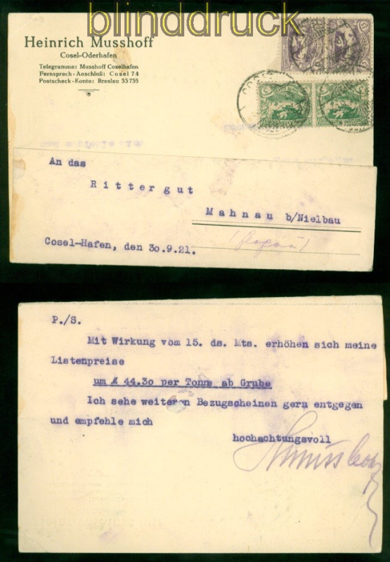 Oberschlesien Mi # 15 (2) und 17 (2) MiF Postkarte Cosel 30.9.1921 Mahnau(57685)