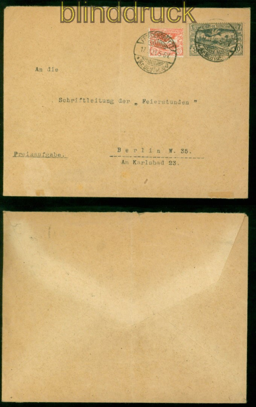 Abstimmungsgebiete Oberschlesien Mi # 16 und 22 MiF Fernbrief Friedrichshütte 17.11.1921 nach Berlin 10 Pfennig mit 50 Pfennig Freimarken als Mischfrankatur auf Fernbrief aus Friedrichshütte 17.11.1921 nach Berlin Ortsstempelnummer laut Handbuch: 085.1 Erhaltung siehe Scan