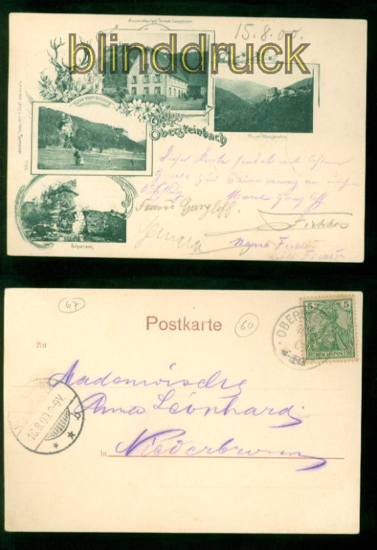 Elsass Gruss aus Obersteinbach sw-AK vier Ansichten 1900 nach Niederbronn vier Ansichten: Gastwirtschaft Fricker Sensfelder, Ruine Wasigenstein, Ruine Klein-Arnsburg und Schoeneck Karte gelaufen aus Obersteinbach 15.08.1900 nach Niederbronn Ankunftsstempel Erhaltung siehe Scan