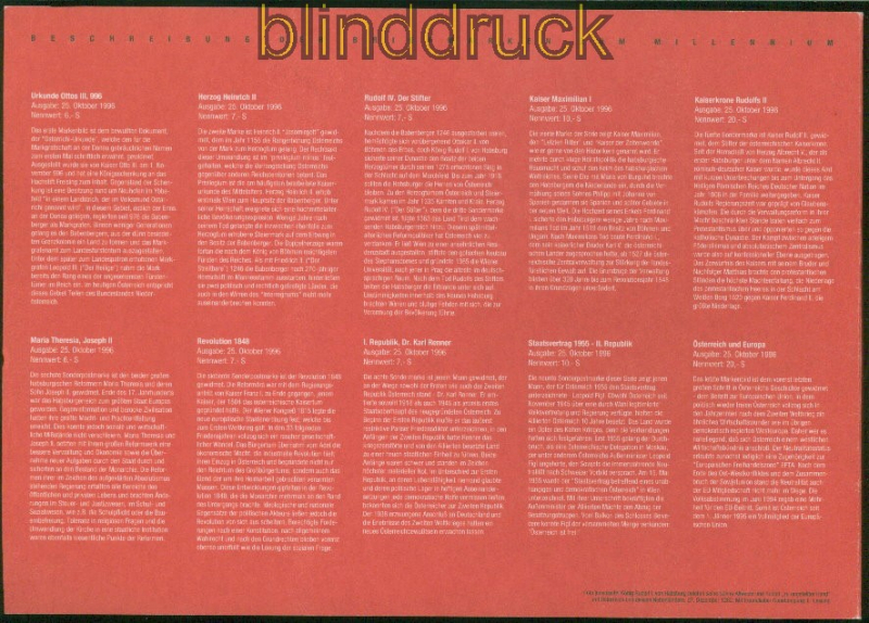 Österreich 1996 Gedenkblatt 1/96 1000 Jahre Österreich 1000 Jahre Österreich Gedenkbklatt 1/96 mit allen Ausgaben incl. Block und Schwarzdruck Block ist postfrisch die Marken sind wie üblich gestempelt Erhaltung siehe Scan