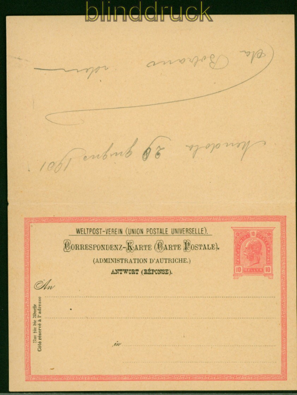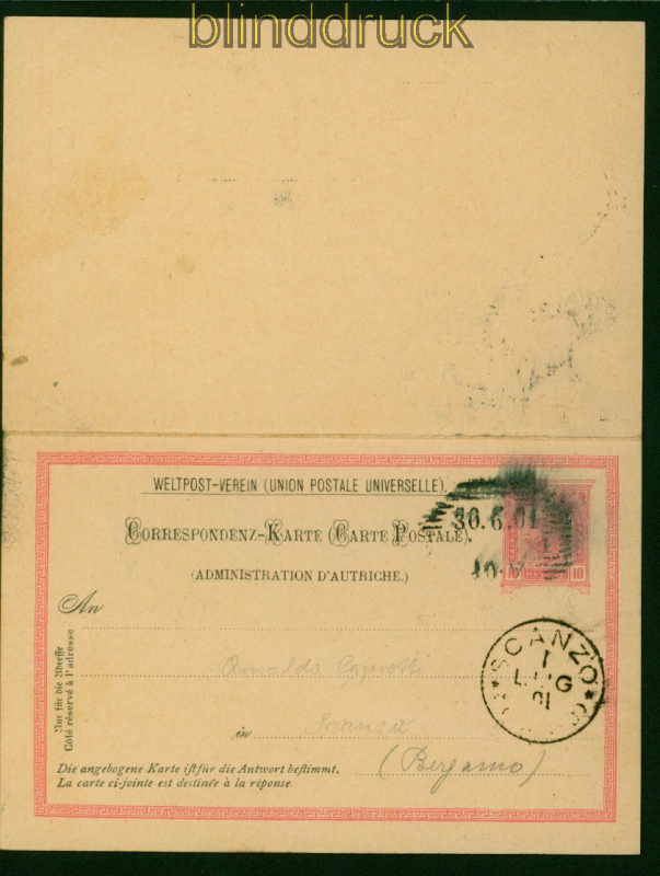Österreich GSK 10 Heller Doppelkarte Mendola 30.6.1901 nach Scanzo bei Bergamo 10 Heller karmin als Doppelkarte Freageteil gestempelt 30.6.1901 rückseitig geschrieber Aufgabeort Mendola 19.6.1901 gelaufen nach Scanzo Ankunftsstempel Erhaltung siehe Scan