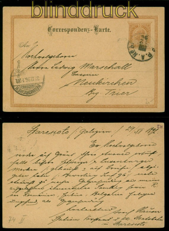Österreich GSK Fahrendes Postamt F.P.A. No. 5? 1896 nach Neukirchen bei Trier 2 Kreuzer braun Ganzsachenkarte Werteindruck entwertet F.P.A. No. 5? Fahrendes Postamt gelaufen xx.12.1896 nach Neukirchen bei Trier Anklunftsstempel Erhaltung siehe Scan