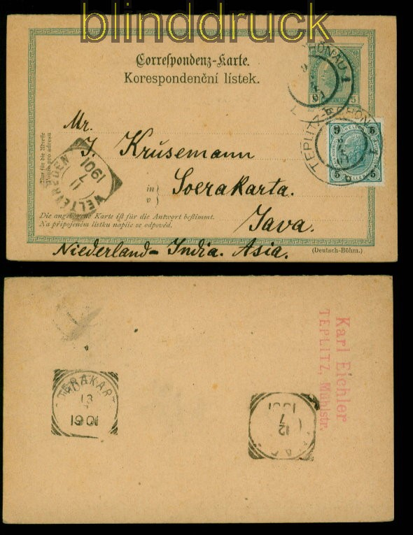 Österreich GSK P 142 mit Zusatzfrankatur Mi # 72 Teplitz 1901 nach Java 5 Heller dunkelgrün Ganzsachenkarte komplett als Frage- und Antwortteil Deutsch-Böhmischer Text mit Zusatzfrankatur 5 Heller Frageteil mit Bedarfstext Antwortteil ohne Text und ungebraucht gelaufen aus Teplitz-Schönau 9.1.1901 nach Soerakarta auf Java Niederländisch-Indien Ankunftsstempel Erhaltung siehe Scan