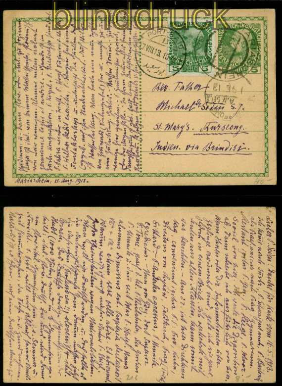 Österreich GSK P 216 MiF Mariasohein 1913 nach Indien Leitvermerke 5 Heller grün Ganzsachenkarte mit Zusatzfrankatur 5 Heller Karte gelaufen aus Mariasohein (Böhmen) 21.5.1913 nach Kurseong in Indien mit Leitvermerk via Brindisi Durchgangsstempel Port Said und Ankunftsstempel gute Erhaltung siehe Scan