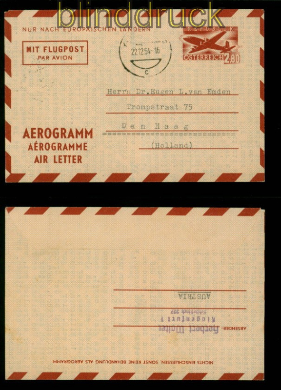 Österreich Luftpostfaltbrief Mi # LF 3 gestempelt Klagenfurt nach Holland 2,80 Schilling braun Luftpostfaltbrief gelaufen aus Klagenfurt 22.12.1954 nach Den Haag in Holland innen komplett mit Schreibmaschine beschrieben gute Erhaltung siehe Scan
