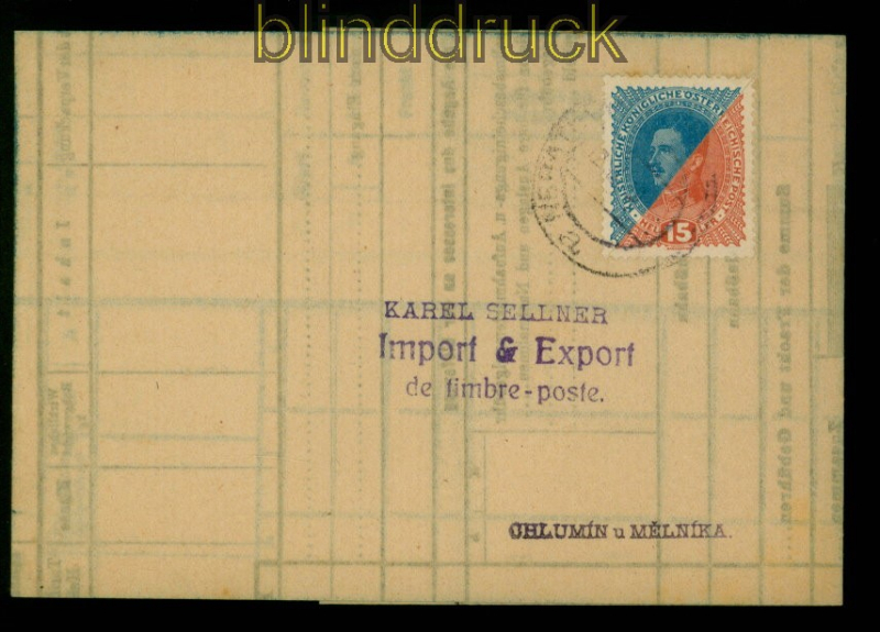 Österreich Mi # 221 und 223 diagonale Halbierung zusammengesetzt Neratovice 12.2.1919 philatelistisches Machwerk 15 Heller rot und 25 Heller blau beide Marken diagonal halbiert und zusammengesetzt auf Vorlage einer Frachtkartenkopie diese innen gestempelt mit blauen L1 Chlumin gestempelt Neratovice 12.2.1919 adressiert an einen Briefmarkenhändler in Chlumin u Melnika Erhaltung siehe Scan