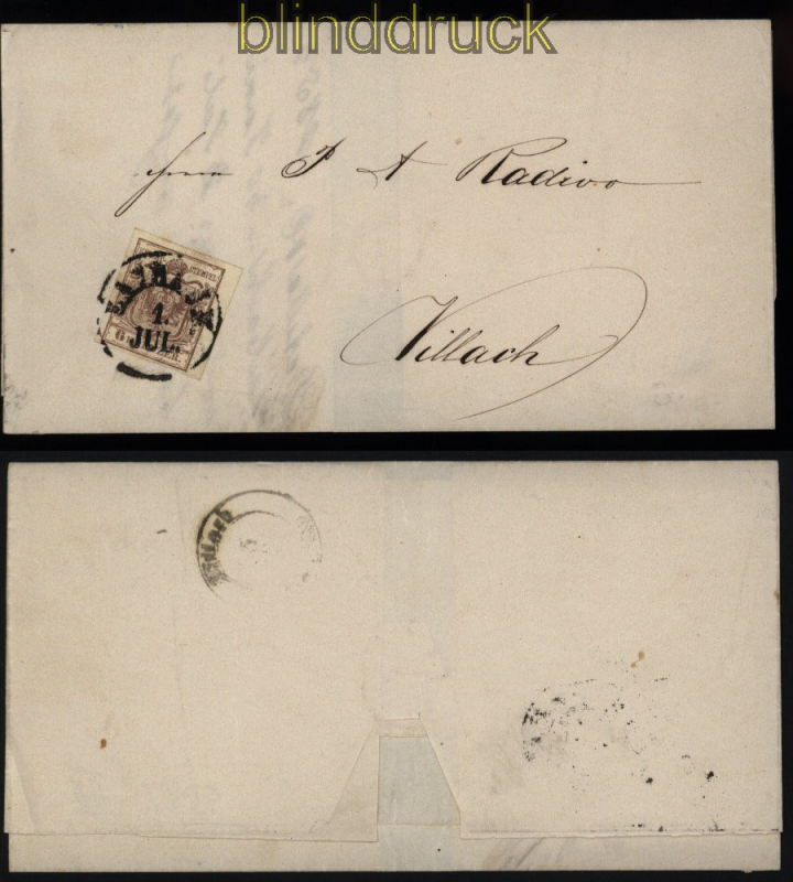 Österreich Mi # 4 X EF Laibach 1.7.1853 nach Villach 6 Kreuzer braun als Einzelfrankatur EF auf Brief aus Laibach 1.7.1853 nach Villach Erhaltung siehe Scan