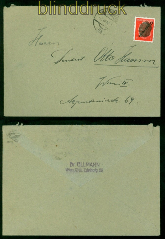 Österreich Mi # 662 I EF Aufdruckmarke mit Schwärzung Ortsbrief Wien 3.7.1945 erste Wiener Aushilfsausgabe Aufdruckmarke 8 Pfg. mit zusätzlicher Schwärzung