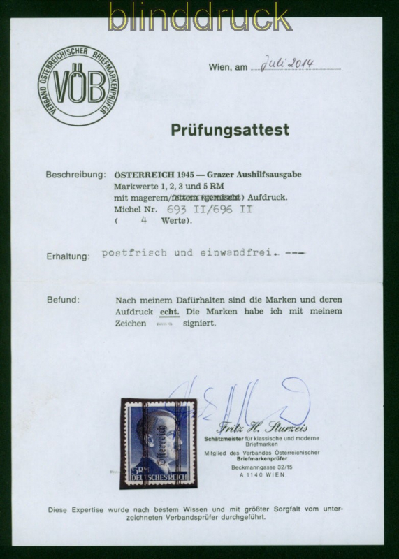Österreich Mi # 693 II/696 II postfrisch Grazer Aushilfsausgabe Attest Sturzeis 1 RM bis 5 RM Grazer Aushilfsausgabe mit dünnem Aufdruck komplette Ausgabe postfrisch Fotoattest Sturzeis VÖB: postfrisch und einwandfrei Erhaltung siehe Attest und Scan
