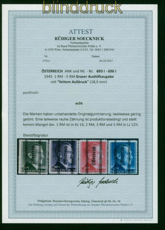 Österreich Mi # 693 I/696 I postfrisch Grazer Aushilfsausgabe Fotoattest Soecknick 1 RM bis 5 RM Grazer Aushilfsausgabe mit fettem Aufdruck komplette Ausgabe postfrisch Fotoattest Soecknick BPP: postfrisch, echt, Originalgummierung Erhaltung siehe Attest und Scan