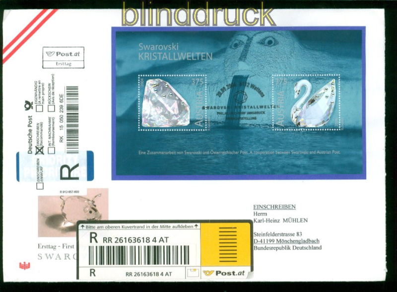 Österreich Mi # Block 25 Swarowski auf Auslands-Einschreiben vom Ersttag 7,50 Euro Swarowski-Block auf Auslands-Einschreiben vom Ersttag FDC gelaufen aus Wattens 20.9.2004 nach Mönchengladbach Erhaltung siehe Scan