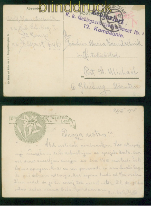 Österreich Österreich Schmuck-Feldpostkarte 1. WK Vom Kärtner Land 1918 nach Hinterliebitsch Schöne Schmuckfeldpostkarte Vom Kärtner Land Für Witwen und Waisen des K. u. k. Gebirgschützenregiment Nr. 1 gelaufen K.u.K. Feldpostamt 646 30.3.1918 nach Hinterliebitsch Post St. Michael bei Bleiburg Kärnten mit Zensur des K.K. Gebirgsschützenregiment Nr. 1 12. Komapnie Erhaltung siehe Scan