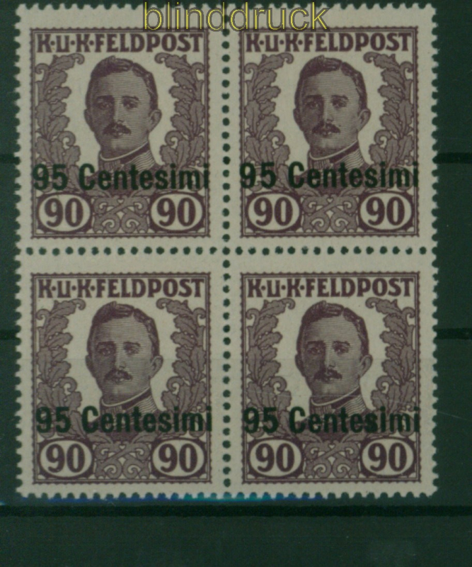 Österreich Ungarn Feldpost für Italien Mi # XIII postfrischer 4er-Block Österreich-Ungarische Feldpost Aufdruckmarke 95 Centesimi auf 90 Heller dunkellila im 4er-Block postfrisch Erhaltung siehe Scan