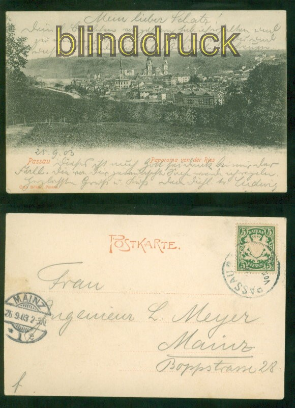 Bayern Passau sw-AK Panorama von der Ries 1903 nach Mainz Karte gelaufen aus Passau 25.9.1903 nach Mainz Erhaltung siehe Scan