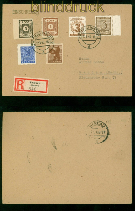 PLokalausgaben Plauen Mi # 6 y in MiF mit 5 weiteren Werten SBZ R-Brief Zwickau 12.1.1946 nach Werdau Plauen 20 Pfg. Volkshilfe amtliche Ausgaben in Mischfrankatur mit 5 weiteren SBZ-Werten portogerecht auf Einschreiben aus Zwickau 12.1.1946 nach Werdau Erhaltung siehe Scan