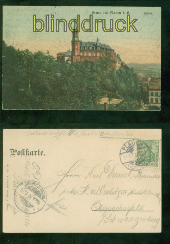 Sachsen Gruss aus Plauen i. V. farb-AK Schloss 1904 nach Schwarzenberg Karte gelaufen aus Plauen 31.5.1904 nach Schwarzenberg Erhaltung siehe Scan