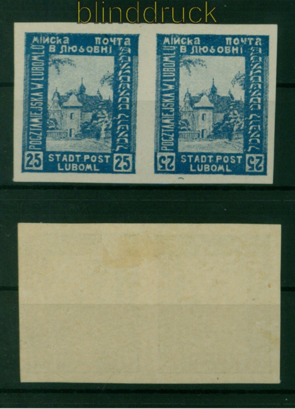 Polen Luboml Mi # IV KU ungebraucht mit Falz Kehrdruckpaar geschnitten Ausgaben von Bezirks- und Lokalbehörden Bestellpostanstalten 1915 - 1918 25 H blau Kehrdruckpaar aus Druckbogen geschnitten ungebraucht mit Falz Erhaltung siehe Scan