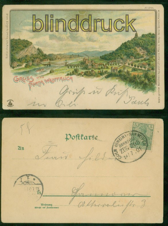 Nordrhein-Westfalen Gruss aus Porta Westfalica farb-AK Gesamtansicht Bahnpost 1901 nach Hannover Karte gelaufen mit Bahnpost Köln (Rhein) - Hannover Zug 205 14.7.1901 nach Hannover Ankunftsstempel Erhaltung siehe Scan