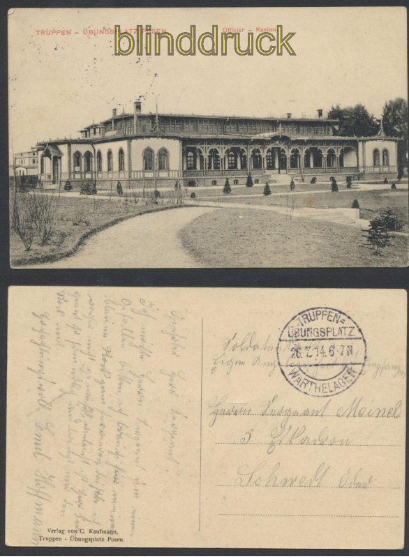 Posen Truppenübungsplatz sw-AK Offiziers-Kasino Soldatenbrief 1914 Karte gelaufen als Soldatenbrief Eigene Angelegenheit des Empfängers Truppenübungsplatz Warthelager 26.7.1914 nach Schwedt Erhaltung siehe Scan