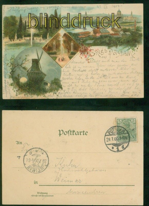 Brandenburg Potsdam farb-Litho-AK vier Ansichten 1900 nach Weimar viewr Ansichten mit Mühle Karte gelaufen aus Potsdam 29.7.1900 nach Weimar Erhaltung siehe Scan