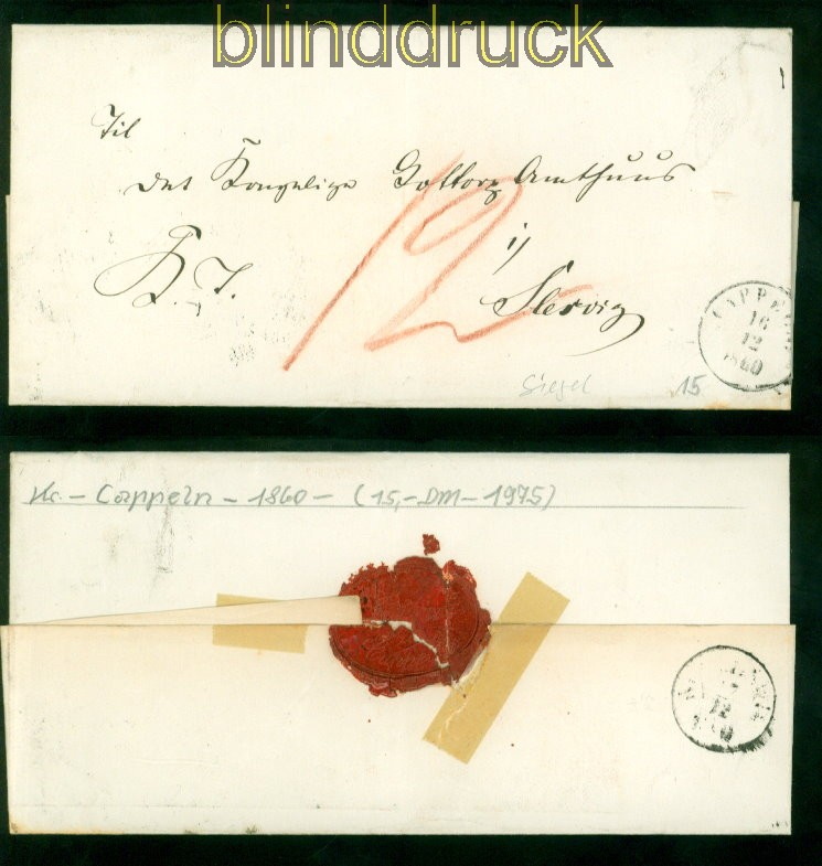 Preussen markenlose Briefhülle Cappeln 16.12.1860 nach Schleswig aus Cappeln 16.12.1860 nach Schleswig ohne Inhalt mit Gebührenvermerk Ankunftsstempel Erhaltung siehe Scan