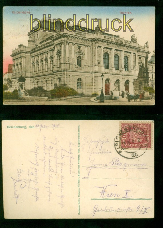 Böhmen Reichenberg farb-AK Theater 1918 Gablonz an der Neiße nach Wien Karte gelaufen aus Gablonz an der Neiße 23.2.1918 nach Wien Erhaltung siehe Scan