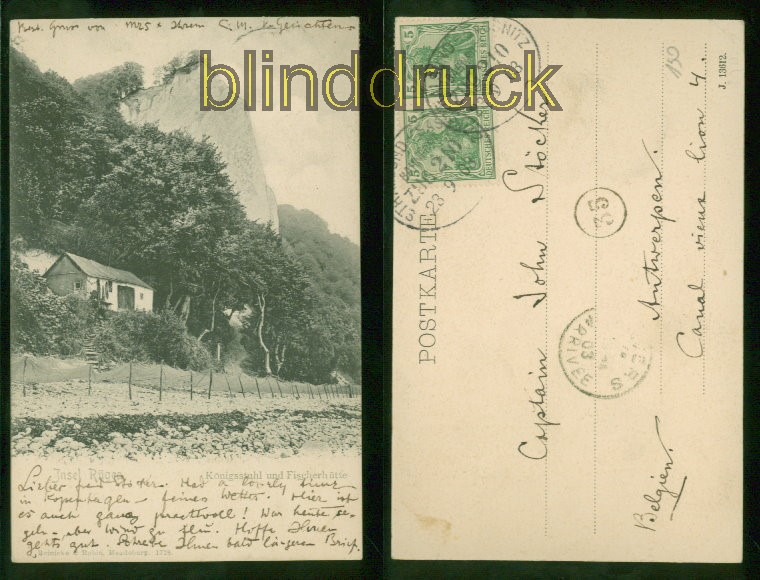 Mecklenburg-Vorpommern Insel Rügen sw-AK Königsstuhl mit Fischerhütte Bahnpost 1903 Karte gelaufen mit Bahnpost Stralsund - Sassnitz Zug 210 23.09.1903 nach Antwerpen Erhaltung siehe Scan