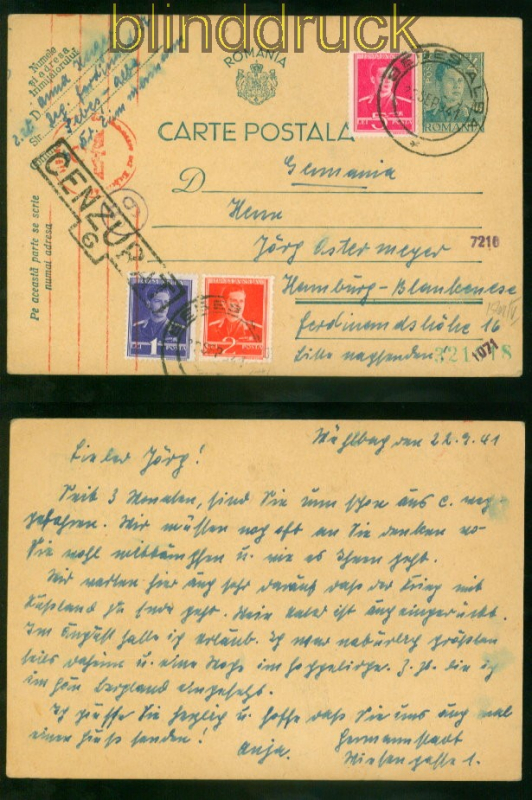 Rumänien Auslands-Zensur-Postkarte Sebes-Alba 22.9.1941 nach Hamburg mit deutscher und rumänischer Zensur Postkarte gelaufen aus Sebes-Alba 22.9.1941 nach Hamburg Karte in der Mitte senkrecht gefaltet Erhaltung siehe Scan