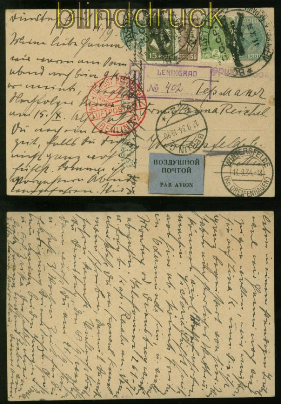 Russland GSK # P 120 mit Zusatzfrankatur auf Auslands-LuPo-R-Karte 1934 3 Kop. Ganzsachenkarte mit Zusatzfranktur auf Auslands-Luftppost-Einschreibenkarte entwertet mit Luftpoststempel 11.9.1934 nach Wintersfelde mit Luftpostdurchgangsstempel Berlin Ankunftsstempel Winterfelde Erhaltung siehe Scan