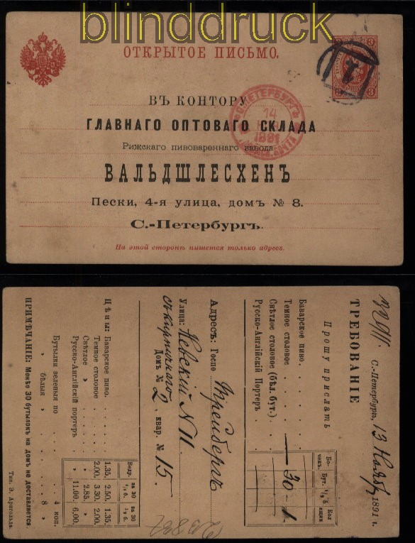 Russland Stadtpost St. Petersburg GSK Ganzsachenkarte 1891 3 Kop. Firmenvordruck-Ganzsachenkarte befördert Stadtpost St. Petersburg Ganzsachenkarte gelaufen 1891 gute Erhaltung siehe Scan