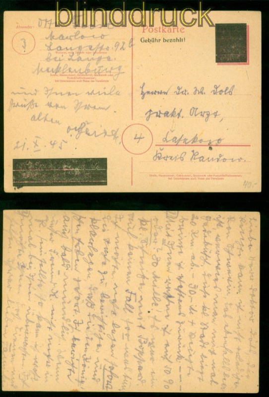 Britische Zone Aufbrauch-GSK P C 893 II Gebühr bezahlt 21.10.1945 Ganzsachenkarte Mi # P C 893 II B01 Behelfsausgabe der Britischen Zone Ganzsachenkarte bedarfsmäßig gelaufen aus Marlow in Mecklenburg nach Lasekow Kreis Randow alte GSK mit Schwärzungen und nebengestzten gedruckten L1 Gebühr bezahlt! die Karte wurde vermutlich magels Stempel nicht abgestempelt sehr seltene Karte Erhaltung siehe Scan
