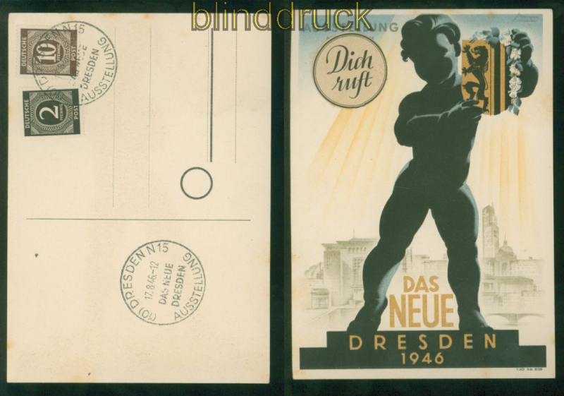 Sowjetische Besatzszone Aussstellungskarte "Das neue Dresden" 1946 Sonderstempel Sachsen 10 Pfg. braun und 2 Pfennig schwarz Kontrollratsausgabe blanko gestempelt mit Ausstellungs-Sonderstempel SSt. Erhaltung siehe Scan