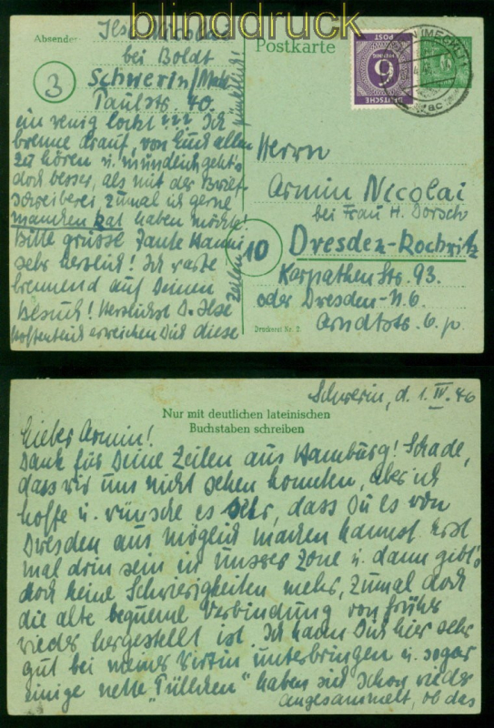 Sowjetische Besatzungszone Mecklenburg-Vorpommern GSK P 6 MiF mit Mi # 916 gestempelt Schwerin 2.4.1946 nach Dresden 6 Pfennig Ganzsachenkarte grünes Papier mit Zusatzfrankatur 6 Pfg. I. Kontrollratsausgabe portogerecht gelaufen aus Schwerin 2.4.1946 nach Dresden Erhaltung siehe Scan