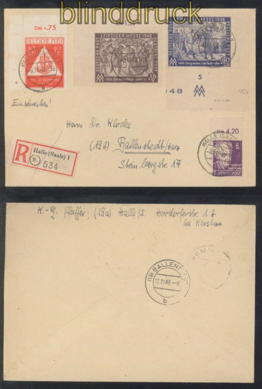 Sowjetische Besatzszone MI # 199 a x mit Druckvermerk in MiF auf R-Brief Halle 50 + 25 Pfg. Leipziger Herbstmesse 1948 mit Druckverk M 301 / C 3285 portogerecht in Mischfrankatur auf Einschreibebrief aus Halle 8.11.1948 nach Ballenstedt rückseitig Ankunftsstempel Erhaltung siehe Scan
