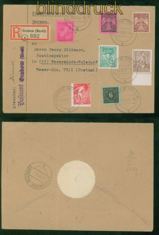 Sowjetische Besatzszone SBZ MI # 23/25 a mit 8 x, 11, 16 und 17 MiF R-Brief Grabow 13.12.1945 geprüft Kramp BPP Mecklenburg-Vorpommern bodenreform komplette Ausgabe mit weiteren Marken auf Sammlerbrief gelaufen als Einschreiben aus Grabow 13.12.1945 Wesermünde geprüft Kramp BPP Erhaltung siehe Scan