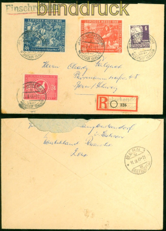 Sowjetische Besatzszone MI # 230/31, 213 und 232 MiF auf AuslandsR-Brief Langburkersdorf nach Bern Leipziger Frühjahrsmesse 1949 in Mischfrankatur portogerecht auf Auslands-R-Brief gelaufen mit Not-R-Zettel aus Longburkersdorf 5.9.1949 nach Bern Erhaltung siehe Scan