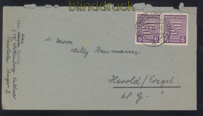 Sowjetische Besatzszone MI # 69 X A a MeF (2) Fernbrief Wittenberg Postmeistertrennung Provinz Sachsen 6 Pfg. Provinzwappen grauviolett Postmeistertrennung aus Wittenberg L 11 1/2 portogerechte Mehrfachfrankatur von 2 Marken auf Fernbrief aus Wittenberg Lutherstadt 2.1.1946 nach Herold im Erzgebirge Brief noch mit Inhalt Erhaltung siehe Scan