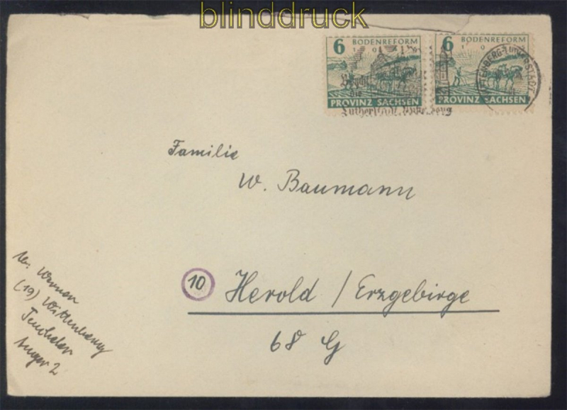 Sowjetische Besatzszone MI # 85 A MeF (2) Fernbrief Wittenberg Postmeistertrennung 1946 Provinz Sachsen 6 Pfg. Bodenreform in der Provinz Sachsen smaragdgrün Postmeistertrennung aus Wittenberg L 11 1/2 portogerechte Mehrfachfrankatur von 2 Marken auf Fernbrief aus Wittenberg Lutherstadt 18.1.1946 nach Herold im Erzgebirge Erhaltung siehe Scan