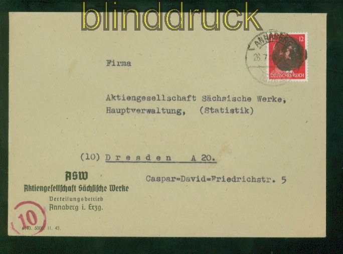 Sowjetische Besatzszone SBZ MI # AP 788 EF sächsische Schwärzung Fernbrief Annaberg 26.7.1945 nach Dresden Sachsen Sächsische Schwärzungen gelaufen als Fernbrief Annaberg 26.7.1945 nach Dresden Firmenbedarfsbrief Erhaltung siehe Scan