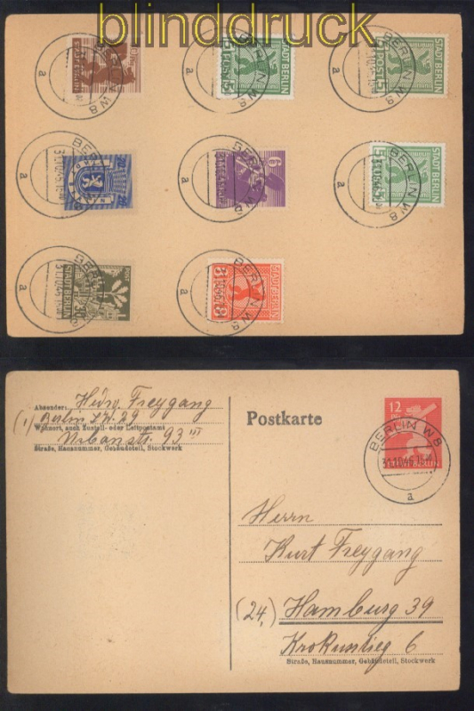 Sowjetische Besatzungszone SBZ Mi # 1/7 A auf Satz-Postkarte vom Letzttag 31.10.1946 Freimarken Berliner Bär und Eiche komplette Aussgabe auf Satz-Postkarte vom Letzttag jede Marke sauber entwertet am Letzttag Berlin W 8 31.10.1946 adressiert nach Hamburg Erhaltung siehe Scan
