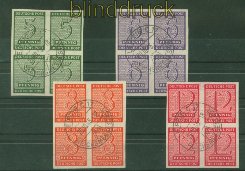 Sowjetische Besatzungszone West-Sachsen Mi # 116/19 X gestempelte 4er-Blöcke Leipzig-Reichsmesse Freimarken Ziffern komplette Ausgabe in 4er-Blöcken Wasserzeichen X gestempelt mit Leipzig-Reichsmesse 28.10.1945 Erhaltung siehe Scan