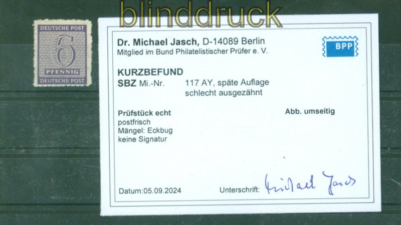 Sowjetische Besatzungszone West-Sachsen Mi # 117 A Y a postfrisch geprüft Kurzbefund Jasch BPP 6 Pfennig lebhaftgrauviolett Postmeistertrennung Mügeln "L 11 1/2" Wasserzeichen Y postfrisch geprüft Kurzbefund Jasch BPP: 117 A Y späte Auflage, schlecht ausgezähnt, echt, postfrisch, Eckbug Erhaltung siehe Scan