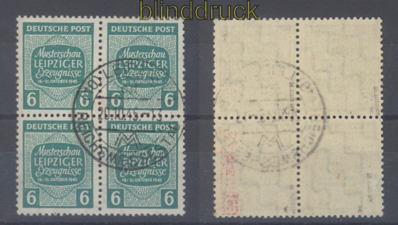Sowjetische Besatzungszone West-Sachsen SBZ Mi # 124 X gestempelter 4er-Block geprüft Dr. Jasch BPP 6 Pfg. Musterschau Leipziger Erzeugnisse gestempelter 4er-Block mit Wasserzeichen X geprüft Jasch BPP Erhaltung siehe Scan