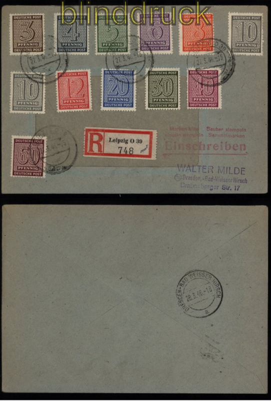 Sowjetische Besatzungszone West-Sachsen Mi # 126/37 X auf Satz-R-Brief Leipzig 27.3.1946 Wasserzeichen X Freimarken komplette Ausgabe Wasserzeichen X auf Satz-R-Brief aus Leipzig 27.3.1946 nach Dresden Ankunftsstempel Erhaltung siehe Scan